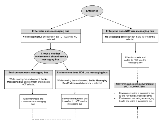 - After you configure an environment to use or not to use a messaging bus, you cannot switch to the other configuration. For example, if an environment does not use a messaging bus, you cannot switch to using a messaging bus and vice versa.