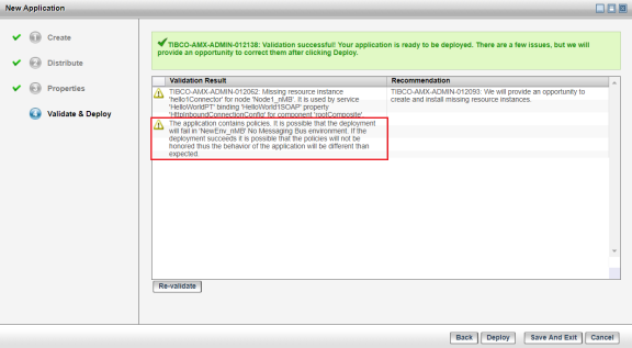 - For an environment that does not use the messaging bus, you can still deploy applications that use a virtualization-related policies which rely on the messaging bus. However, the policies may not be honored at runtime. The following warning is displayed during the deployment of the application: