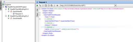 DAA, through TIBCO ActiveMatrix Administrator UI to an ActiveMatrix Runtime Node. Select theDAAfrom the following location depending on the Implementation Type on which the Service Health Check is performed.for Java IT select,jv.helloworld1.soa.daa from helloworld1.zipfor Mediation IT select,mediation.helloworld.log.daa from helloworld1_mediation.zip - Import the HealthCheckSOAPProject-soapui-project into SoapUI. This project is applicable for SOAP version 1.1.