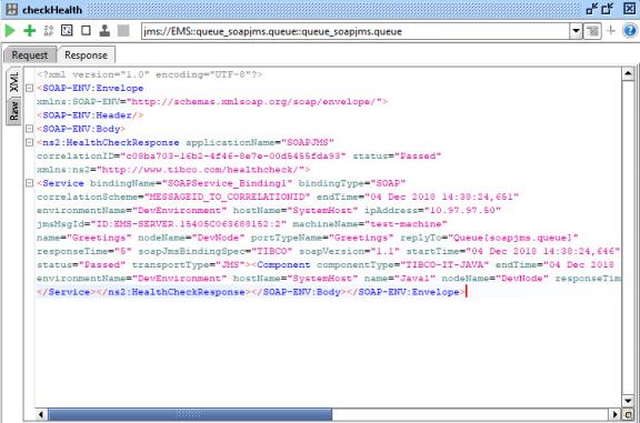 HealthCheck_SOAP_JMS.wsdl: concrete WSDL describing the Service Health Check contract provided by each ActiveMatrix SOAP/JMS service out-of-the-box. The WSDL describes the schema for the Service Health Check request and response in terms of all the elements and their attributes. The WSDL also includes Sample SOAP/JMS Bindings for SOAP Versions 1.1 and 1.2.SampleProjectForSOAPJMS.zip: .zip file containing the sampleDAA,SOAPJMS.daaand its corresponding SOA project. The applicationSOAPJMSconsists of a SOAP/JMS Binding and Java Implementation Type (IT).