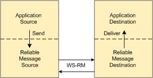 An AS wants to reliably send messages to an AD over an unreliable infrastructure. To accomplish this it uses a reliable message source (RMS) and a reliable message destination (RMD). The AS sends a message to the RMS. The RMS uses the WS-Reliable Messaging (WS-RM) protocol to transmit the message to the RMD. The RMD delivers the message to the AD. If the RMS cannot transmit the message to the RMD for some reason, raises an exception or otherwise indicates to the AS that the message was not transmitted. The AS and RMS can be implemented within the same process space or they be separate components. Similarly, the AD and RMD can exist within the same process space or be separate components.