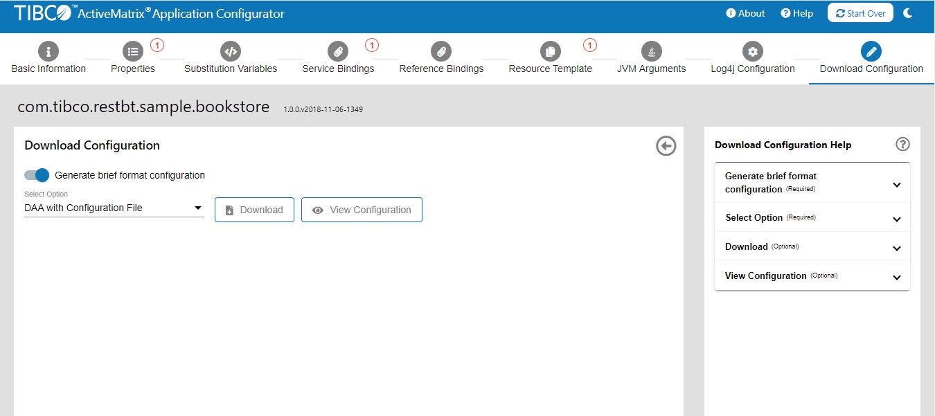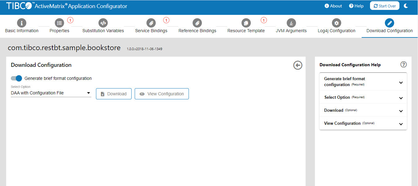 fullorbriefdepending on the option you have selected in the previous step.Note: If you click View Configuration and save the configuration file from the browser, the file is saved with the underscore (_) instead of dot (.) in the application name. For example, if application name iscom.tibco.sample.bookstore, then the file is saved with the namecom_tibco_sample_bookstore. - Select one of the following options from the drop-down list:
