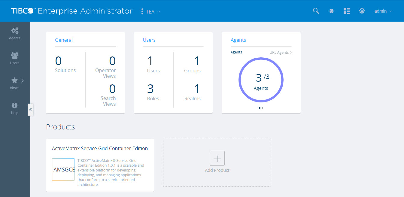 Signing in to the Application Monitor displays the TIBCO Enterprise Administrator landing page. The user name with which you have logged in is shown on the title bar. The landing page displays cards with information about the general details, users, agents, and products exposed to the TIBCO Enterprise Administrator server. All the products (for example, ActiveMatrix Service Grid - Container Edition) exposed to the server are displayed as cards. You can click the links on the cards to drill down to further details.