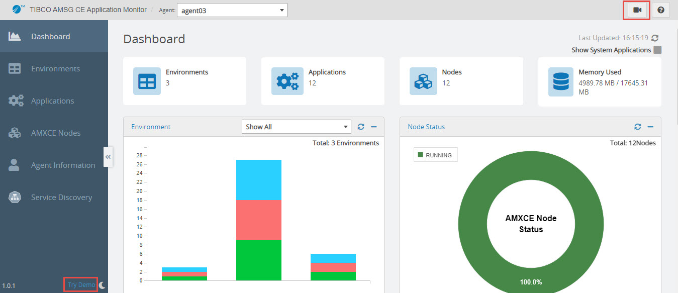 in the upper-right corner of the Dashboard page. You can try the demo of Application Monitor by clicking Try Demo at the bottom of the left sidebar when expanded. The Try Demo button is not displayed on Environments details, AMXCE Node details, and Application details pages.