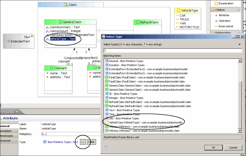 - In the GenericClaim class, click vehicleType. Look below at the General tab of the Properties view for the vehicleType attribute. Notice that the type is currently the default type of Text. Click the ellipsis icon to open the Select Type dialog. Click VehicleType and click OK.