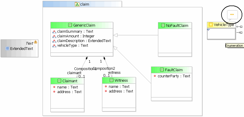 - Return to the business object model and click the vehicleType attribute within the GenericClaim class. In the General tab of the Properties view, change the multiplicity from 0..1 to 1.