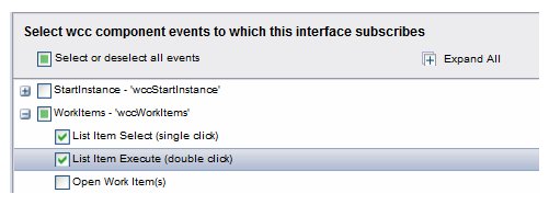The Select wcc component event to which this interface subscribes pane lists all WCC components and the events published by those components.