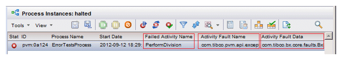 A special process view is available that displays process attributes containing information to help determine the reason a task failed, causing a process instance to be halted.