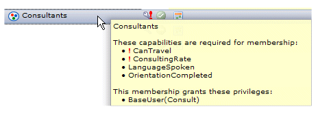 Hovering the mouse pointer over a group or position name in the Resource Editor displays a pop-up that lists the privileges that will be granted to resources that are mapped to the group or position (it also shows the capabilities required for membership).