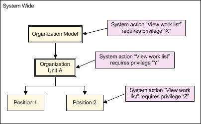 For example, in the following diagram the "View work list" system action has been associated with three different privileges, "X", "Y" and "Z", at three different level - the organization model, organization unit A, and position 2.