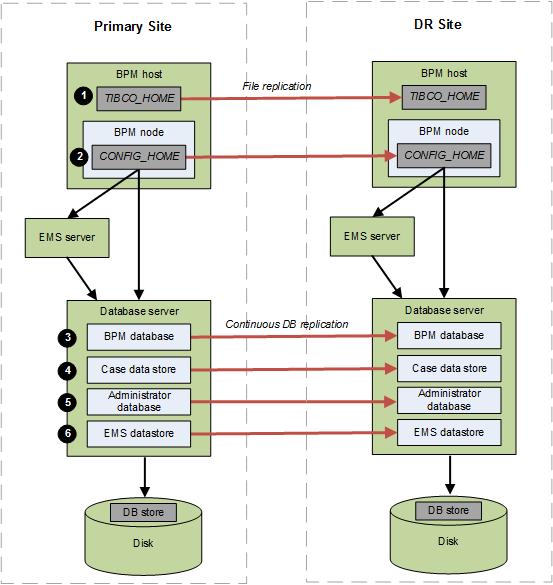 The data-level replication approach requires only file-based and database-based replication software. It ensures that data on the Disaster Recovery (DR) site will be in a consistent state across the various TIBCO ActiveMatrix BPM datastores and will therefore start-up when required.