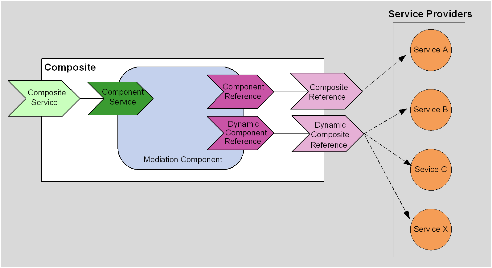 The composite reference is statically bound to Service A. However, the dynamic composite reference can invoke Service B, Service C, or Service X without having to specify a static configuration at design time.
