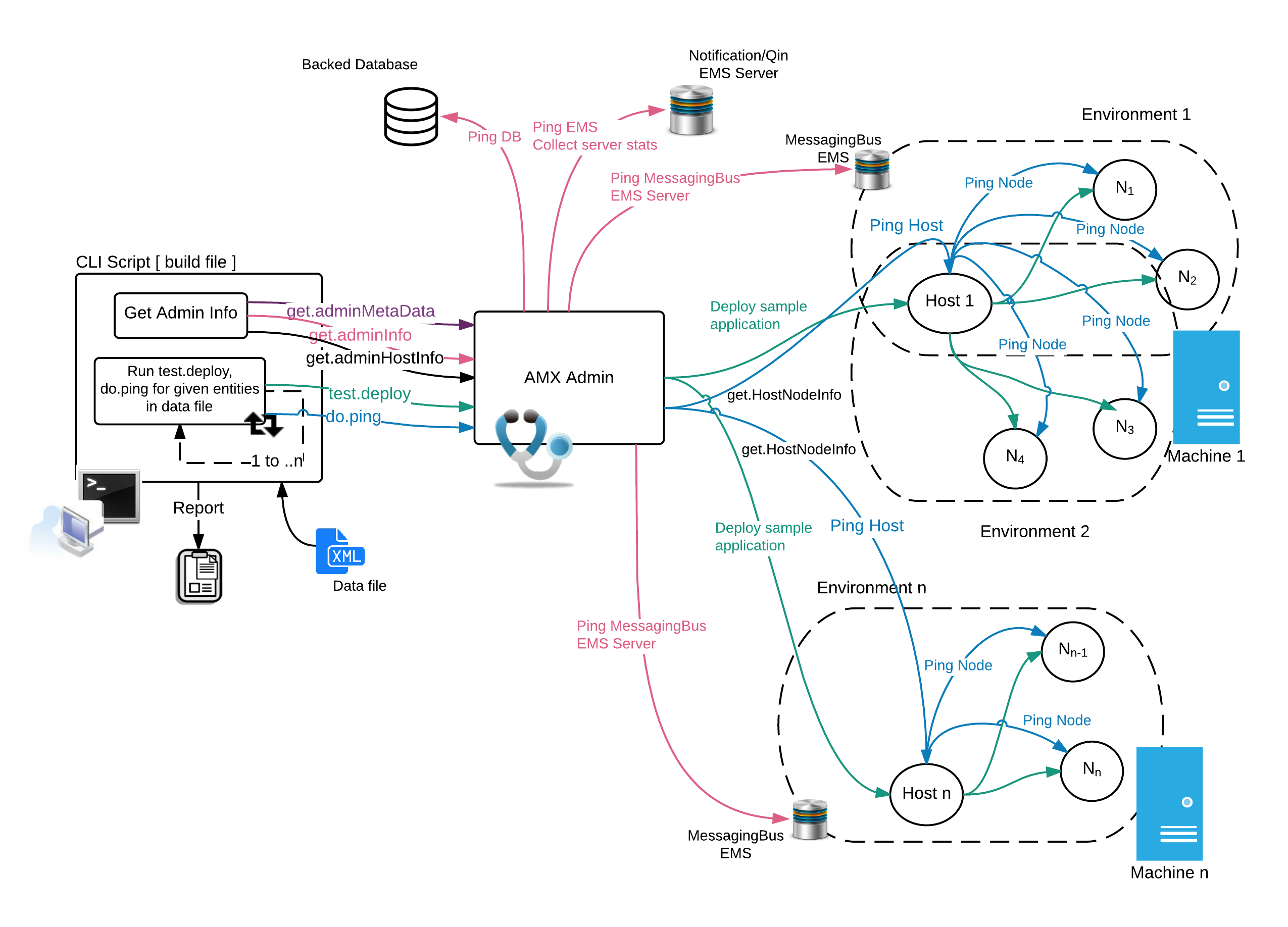 - "get.adminInfo": As seen in the schematic diagram, in this flow, the TIBCO ActiveMatrix Administrator connects to and performs a “test connection” on its backend database and Notification Server (Qin) and performs a “test connection” on the Messaging Bus Configuraiton of each ActiveMatrix Envrionment. It also connects to its own Host (SystemHost in case of SystemNode) and gathers some real-time pool (Database, LDAP) information. If the TIBCO ActiveMatrix Administrator was configured with TIBCO SPM Probe, the connection between the SPM Probe and it’s own EMS Server is also tested.