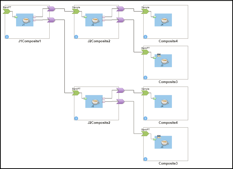 Figure 1 shows Health Check response when Health Check is invoked from promoted service BankPT. It shows Components, Service Bindings and References along the path which are connected. J1Composite1 is first hop. J1Composite1 comprises a promoted service (SOAP/HTTP Binding) BankPT, Java Implementation Type J1 and two promoted References (SOAP/HTTP Binding). If there are multiple References from one Application to the two different services of another Application, they are shown separately in GUI response. Here promoted References from J1Composite1 are connected to two different services of same Application J2Composite2, so they are shown separately.