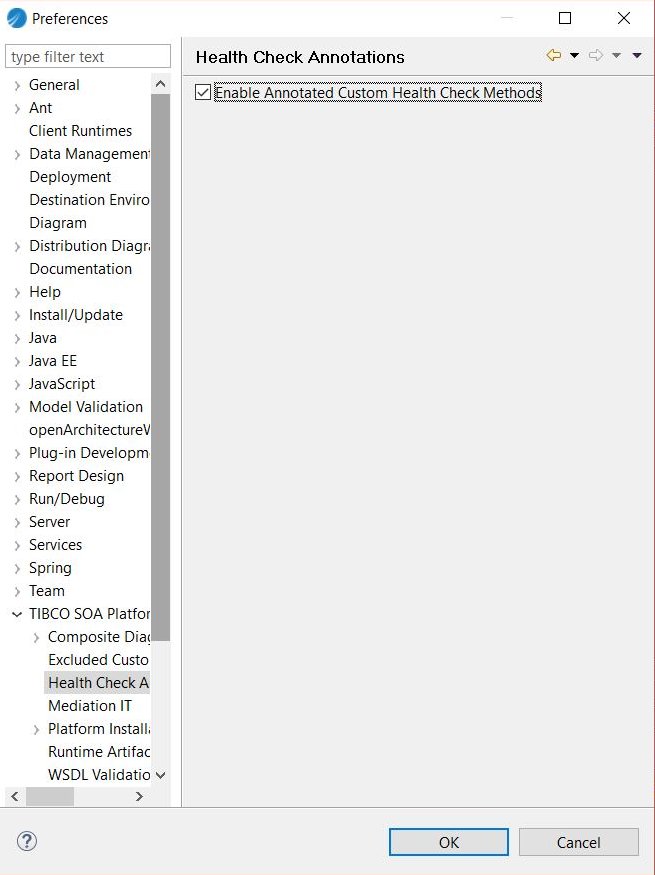 To enable Service Health Check Annotations, select Window > Preferences > TIBCO SOA Platform > Health Check Annotations > Enable Annotated Custom Health Check Methods. By default, this check box is not selected.