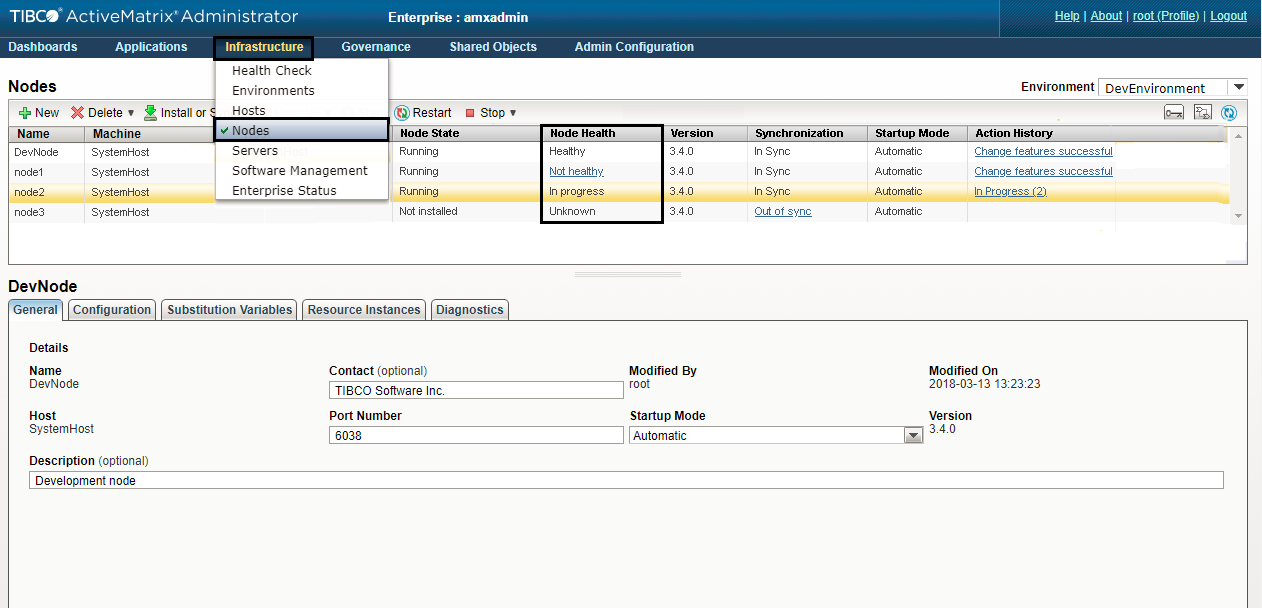 From the ActiveMatrix Administrator UI, click Infrastructure > Nodes. The Node Health column on the Nodes screen indicates the Node's health.