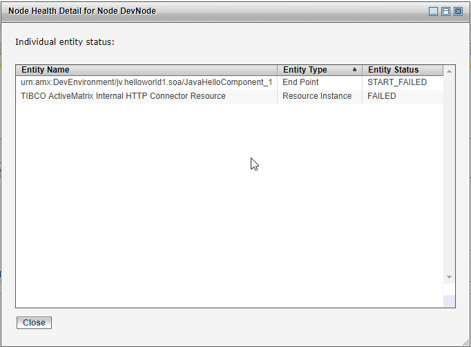 If a Node's health is Not Healthy, click the Not Healthy link to find out which entities are in a failed state. The details of the failed entites are listed in the Node Health Detail dialog as shown below.