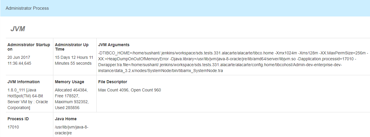 This section provides information related to the OS process of the ActiveMatrix Administrator (JVM), its start time and up time duration. This also includes JVM specific information.