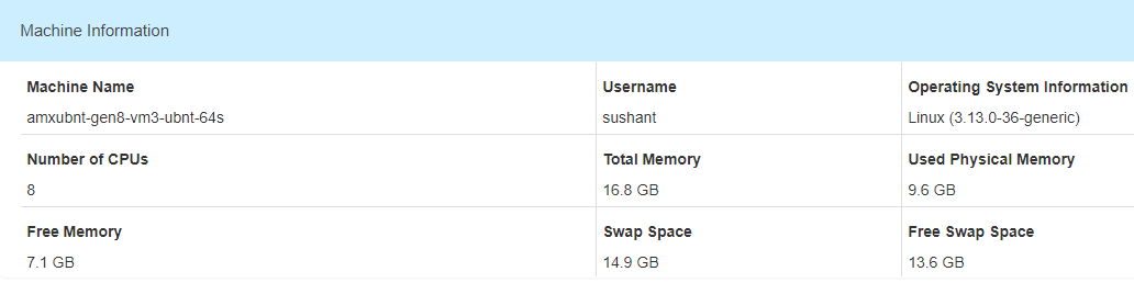 This section is machine-specific. It provides details such as machine name, username, CPU count, operating system, memory, and swap space.