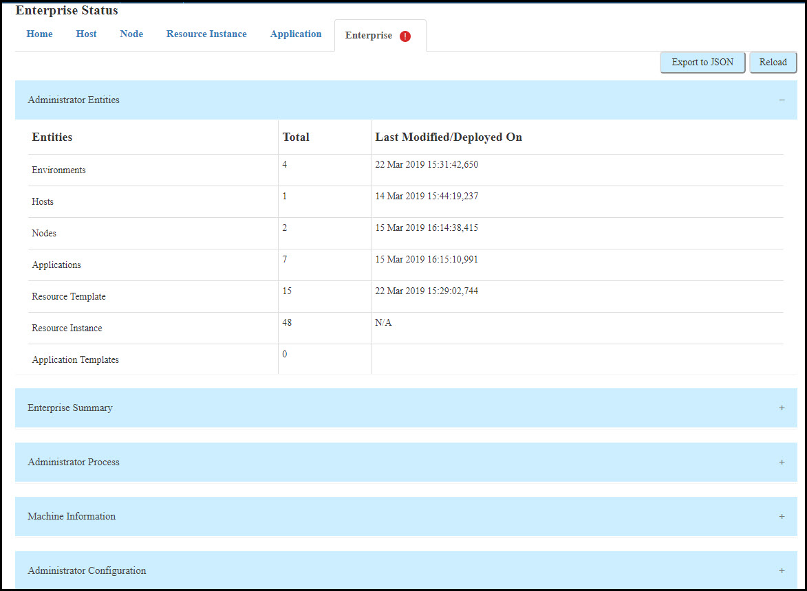 The Enterprise tab, as shown in the following screenshot, has five main sections: Administrator Entities, Enterprise Summary, Administrator Process, Machine Information, and Administrator Configuration. Each of these sections are further described in detail.