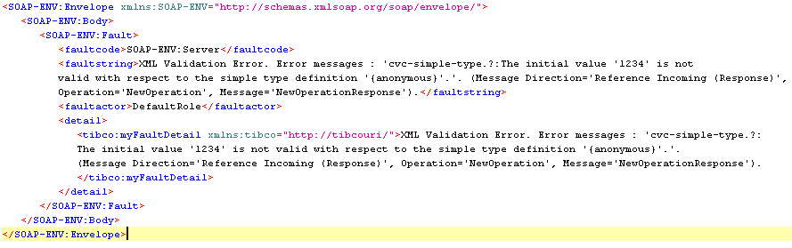In this sample, schema validations are enabled for outgoing SOAP Messages. The SOAP Response shown here is invalid as per the WSDL schema. A Fault Response looks like the following: