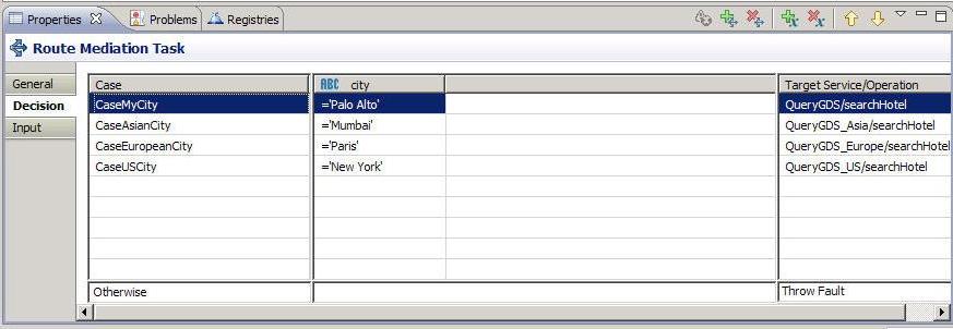 Routing conditions determine which sub-path a message takes. Routing conditions are specified in order, and the message is sent along the sub-path corresponding to the first condition that evaluates to true. The Decision tab of the route tab contains the routing conditions for the route.