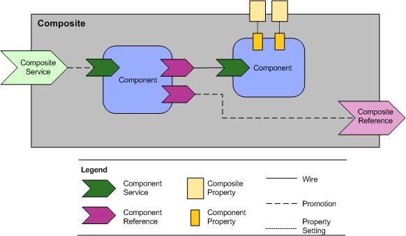 A composite is a configuration of services comprising an application that conforms to a service-oriented architecture. A composite contains components, services, references, the wires that interconnect them, and properties that are used to configure the components. Composites can be nested (contained by other composites). A root composite equates to an SCA application.