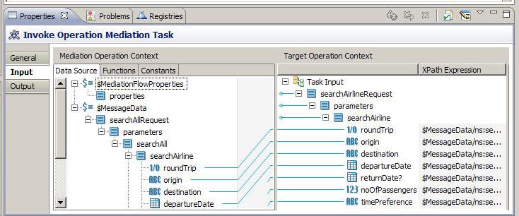 The Invoke Operation task requires an input message for the invoked operation. To construct the input message, use the Input tab of the Invoke tab. The Input tab is a mapper panel, similar to the mapper available in the Transform task. See Transform Tasks for more information about using the mapper panel.