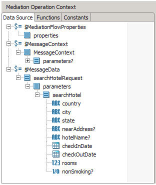 Each of these nodes has its own associated structure. MediationFlowProperties has a complex component named properties and MesageData has a complex component named searchHotelRequest.