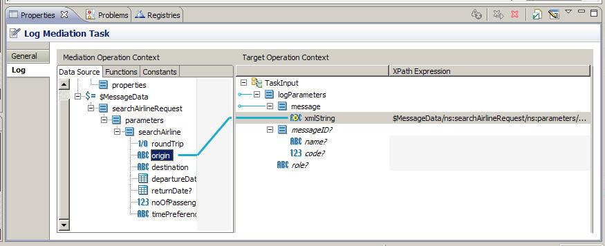 After adding a log task to a path within a mediation flow, specify the type of information you want to log. The Log tab of the Log task configures the information to send to the log file.