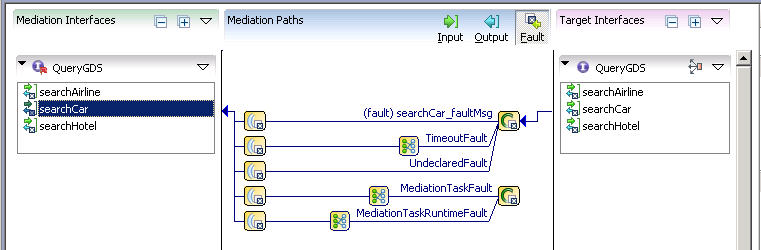 Faults are errors that can occur at any point along the mediation path. Faults are caused by the target service while processing messages. Faults can also explicitly occur during a mediation flow to specify that an unhandled case has occurred. The Mediation Flow Editor enables you to specify a fault path for processing to occur when a fault is encountered.