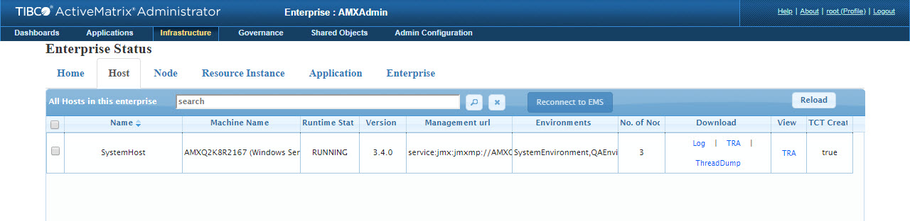 - Reconnect to EMS: You can select the particular host which has lost connection to the EMS server and reconnect to the Notification Server. It recreates all the connections from ActiveMatrix Administrator to the Notification Server and refreshes the status of all entities.