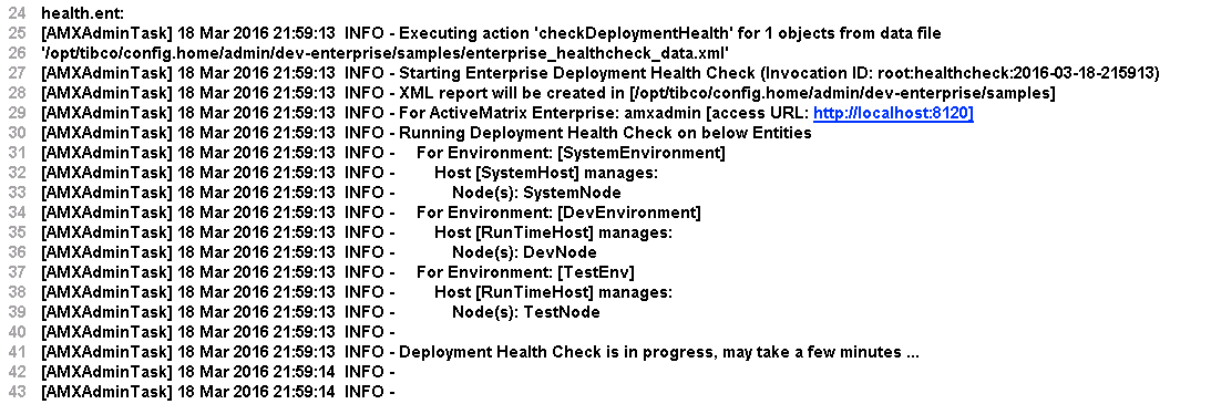 - The next set of lines show the various TIBCO ActiveMatrix entities (Host and Nodes) participating in this Health Check invocation (grouped by Environment name). In case of the "he" ("health.ent") target, the names of the Hosts and Nodes are derived from the TIBCO ActiveMatrix Administrator database and displayed. But in case of targets that work off a selection of entities, such as "health.envs", "health.hosts" or "health.nodes", the names of Hosts and Nodes are derived from the corresponding data file (enterprise_healthcheck_data.xml).