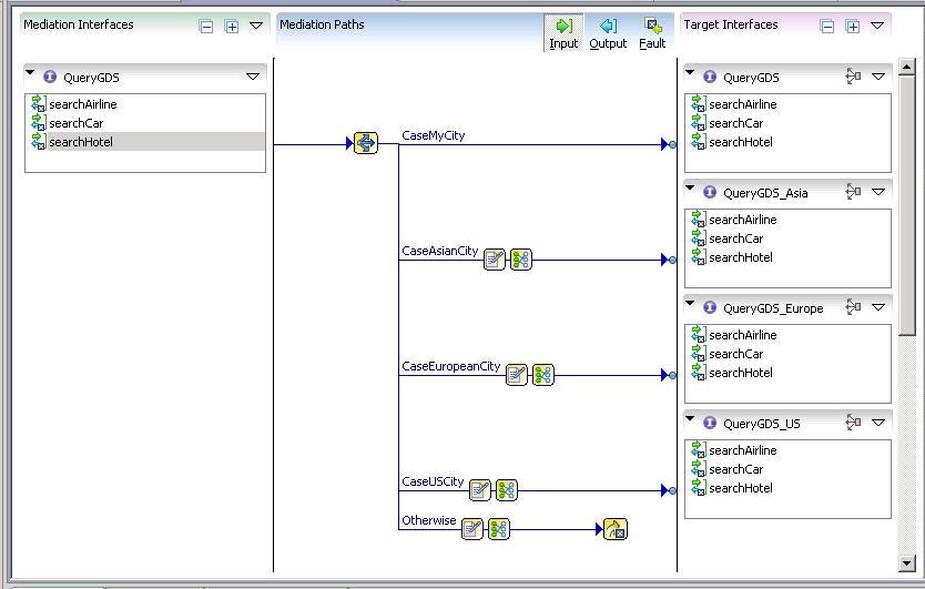 The example shows the input path of a system that searches for travel reservations. For the searchHotel mediation operation, incoming messages are routed to the appropriate service, based on the city specified in the search request: