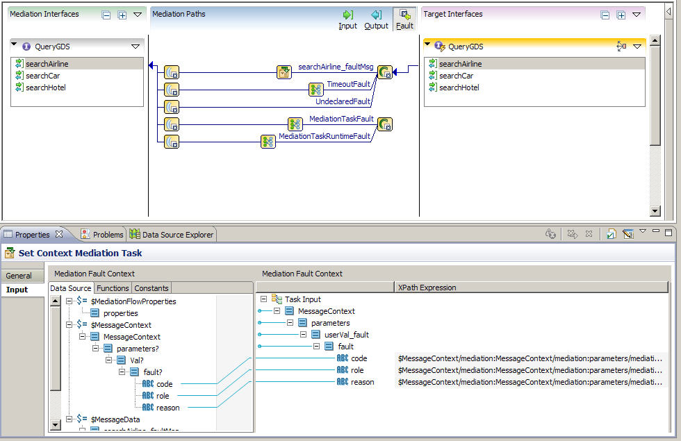 The following screen shows the mapping between the context parameters on the Fault path of the Target interface and that of the Mediation interface.
