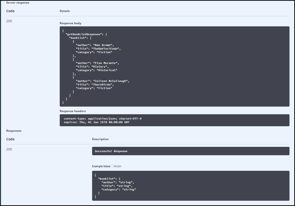 A list of books in the store is returned in the Response section, as shown below.