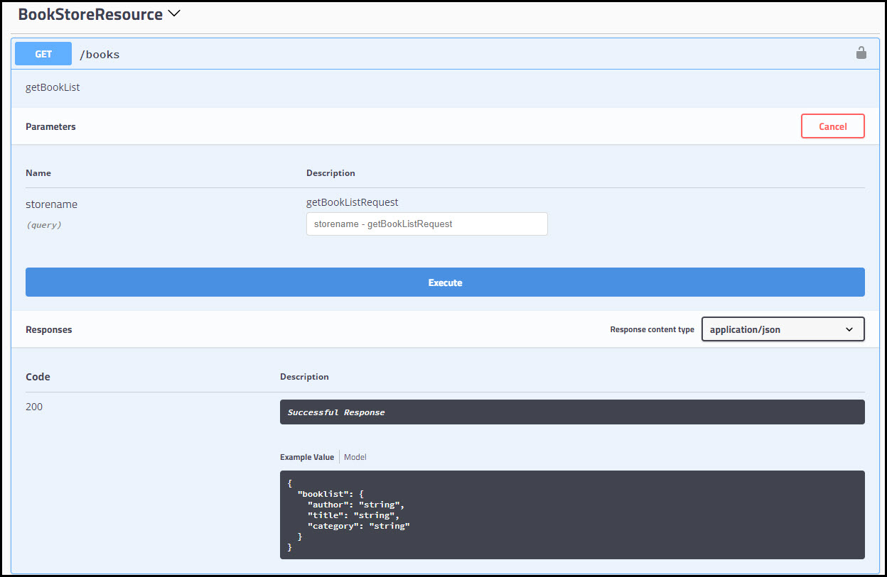 - Expand the Endpoint and click Try it out. The following screenshot shows the BookStore sample shipped with the product as an example.