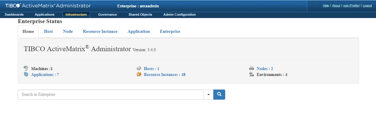 Enterprise: Enables you to check details of an Enterprise such as entities, Enterprise-specific details, processes, machine details, and configuration used by the ActiveMatrix Administrator.