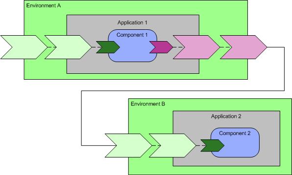• Applications The Services and References defined by an Application can be promoted to the Application's Environment. Services and References promoted to the Environment level can be wired to each other. The following figure illustrates a Service and Reference exposed by a component, promoted to the composite level, promoted again to the Environment level, and wired between the promoted Reference and Service.