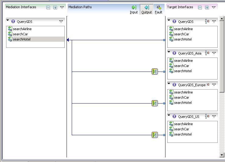Paths on the input flow to a target operation correspond to paths on the output and fault flow from that target operation. Paths ending in Throw Fault have a corresponding mediation fault path on the Fault flow. Paths ending in a Generate Reply task have a single, common Handle Reply path on the Output flow.