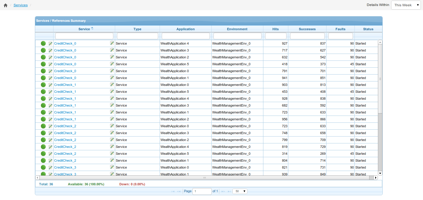The Services dashboard displays all the services and references in the enterprise. Using this dashboard, you can assess the health and view performance metrics of system services.