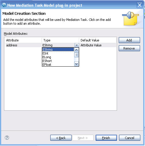 - Specify model attributes that the custom mediation task will use. Model attributes can be given values for each instance of the task, by specifying the values on the General tab in the Properties view for the task.