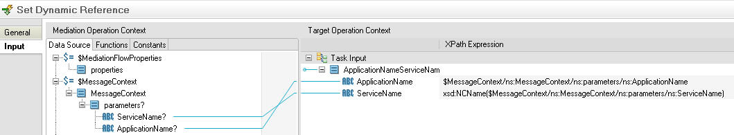 The context parameters are then mapped in the mediation flow's Set Dynamic Reference task property sheet as follows: