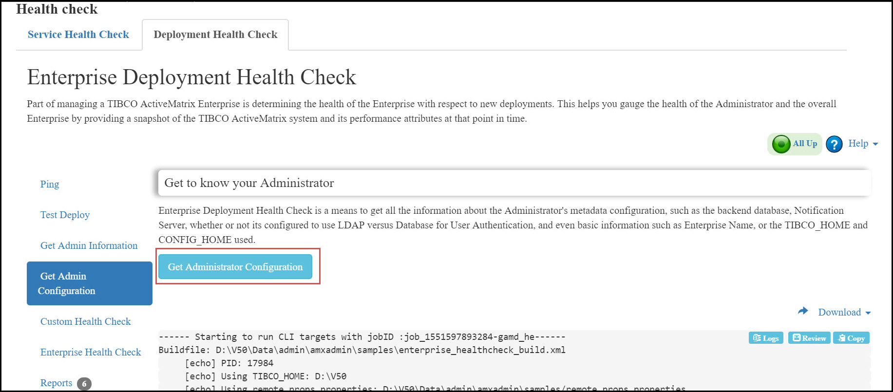 Click the Get Administrator Configuration button for information about configuration (Metadata) of TIBCO ActiveMatrix Administrator. When the execution of test is completed, you can view the report by clicking the Review button as shown in the following image.