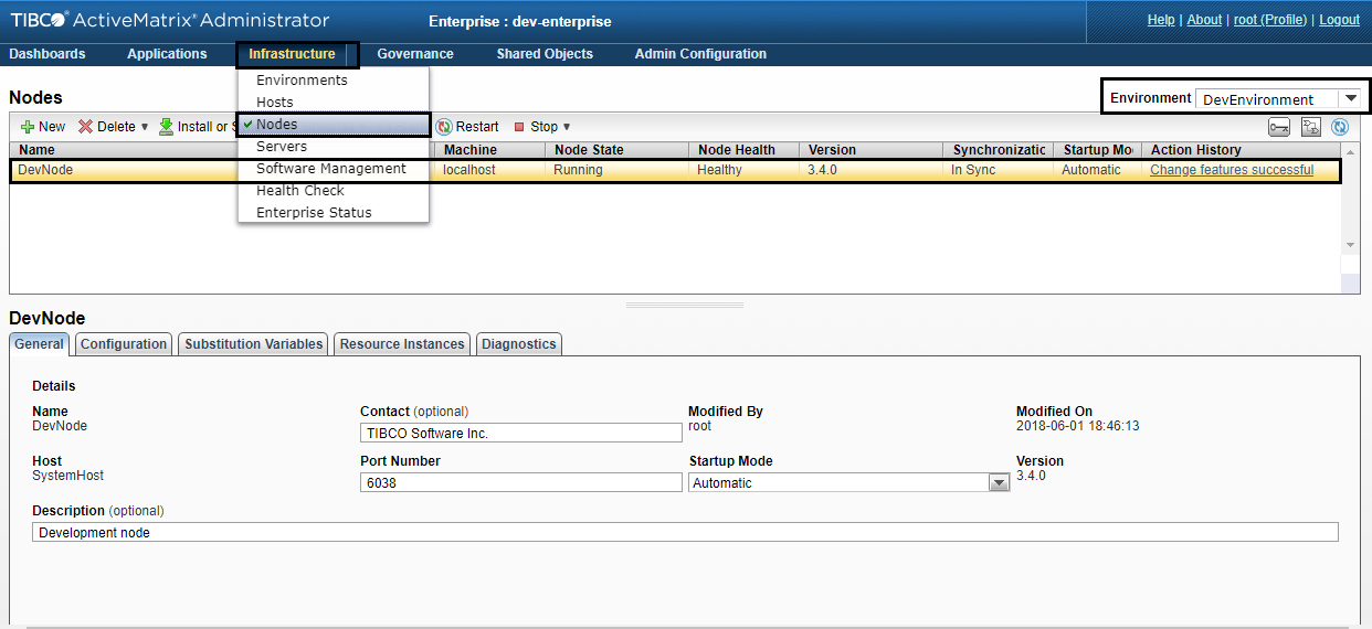 - In ActiveMatrix Administrator, select Infrastructure > Nodes.