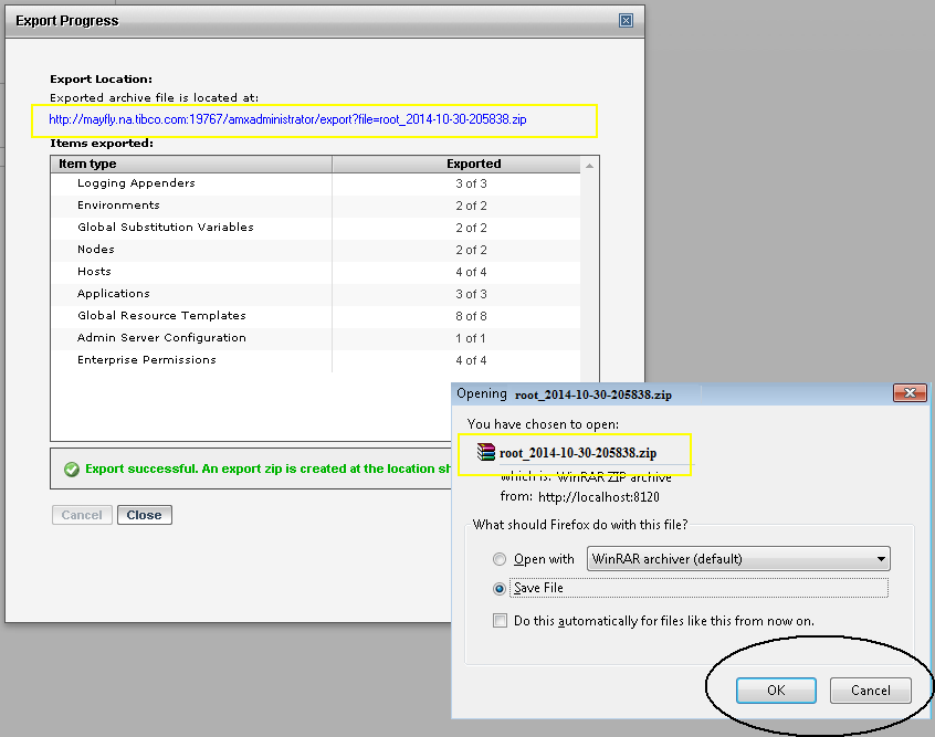 At the end of export, the Export Progress dialog shows the URL of the zip file. You can copy and download the zip file at a later time. The URL always asks for credentials and only a super user is able to download the zip file.