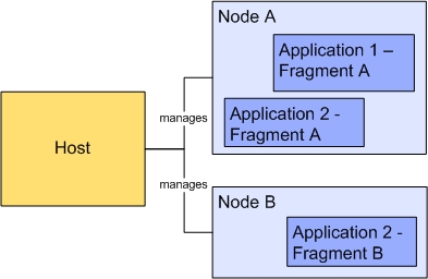 The following figure illustrates a possible configuration of Hosts, Nodes, and Application fragments. The Host manages Node A and Node B. Application 1- Fragment A runs on Node A. Application 2's fragments are distributed over Nodes A and B.
