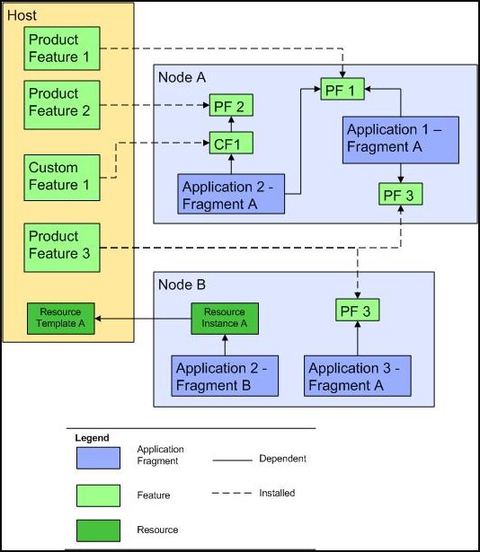 The following figure illustrates a possible configuration of Hosts, Nodes, features, Resource Instances, and Application fragments. In the figure, the Host has three product features: PF1, PF2, and PF3, one custom feature CF1, and one Resource Template A. Custom feature CF1 is dependent on product feature PF2. On Node A, all the available features are installed. Node B has one installed product feature and one installed Resource Instance. Application 1- Fragment A on Node A is dependent on two product features: PF1 and PF3. Application 2- Fragment A is dependent on custom feature CF1 and product feature PF1. Application 2- Fragment B is dependent on Resource Instance A. Application3 - Fragment A is dependent on the product feature PF3.