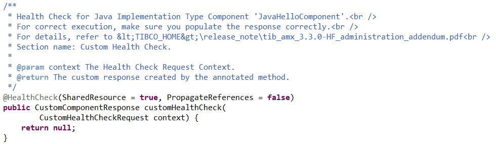 - Annotated Service Health Check method. The parameters of the annotation (SharedResource and PropagateReferences) correspond to the Handle Shared Resources and Handle Component References check boxes shown earlier in the Generate Java Implementation wizard, respectively.