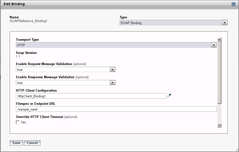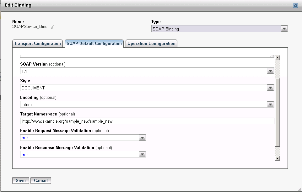 When creating or updating a SOAP Service or Reference Binding through the TIBCO ActiveMatrix Administrator UI, the schema validations can be enabled using the fields Enable Request Message Validation and Enable Response Message Validation, as shown in the following screens. The validations can be enabled or disabled by selecting true and false values from the drop-down respectively.